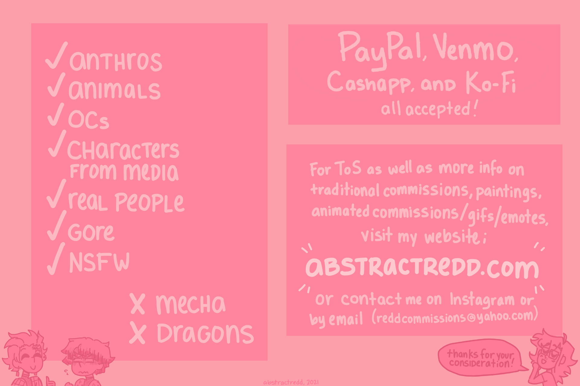 ★ I reserve the right to post a finished piece on my social media platforms, portfolios, etc, unless the client specifies otherwise.★ I reserve the right to adjust the price if designs are particularly complex.★ The first two major revisions are free and should be done in the sketching phase if possible. subsequent edits will be an additional $2 each.★ You may use any artwork you purchase from me as an icon, banner, background image, etc.★ You may NOT trace over the artwork you purchase from me or otherwise recolor it.★ My artwork may NOT be used to train AI, or otherwise put into an AI image generation software.★ If you do not want a piece to be finished at any stage a partial refund can be given based on how much work had been already completed.★ If I have to cancel a commission for any reason you will be given a partial or full refund depending on how much work had already been completed, and the progress that had been made thus far will be sent to you.★ I have the right to keep the payment once the commission is completed in full. Once a piece is finished, there are no refunds, no exceptions.